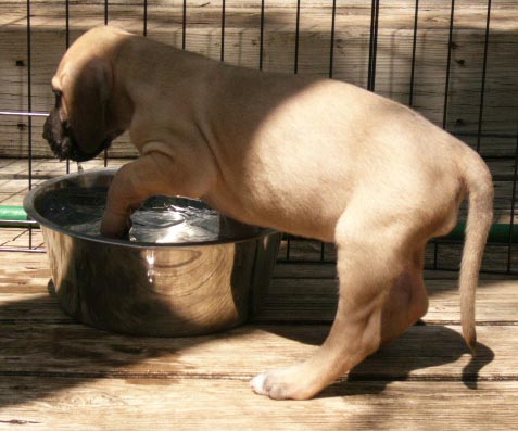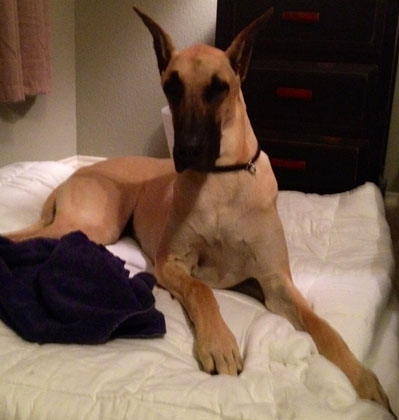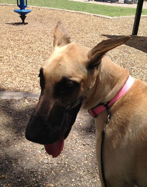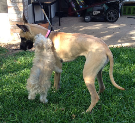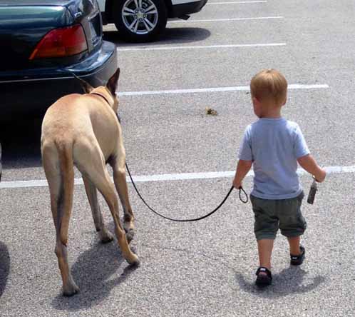 | Kyra is now living with Alan and Katie Kane and their 2 year old. Lots of newness for Kyra! Hudson is doing a great job of walking Kyra on a LOOSE lead. So cute. |